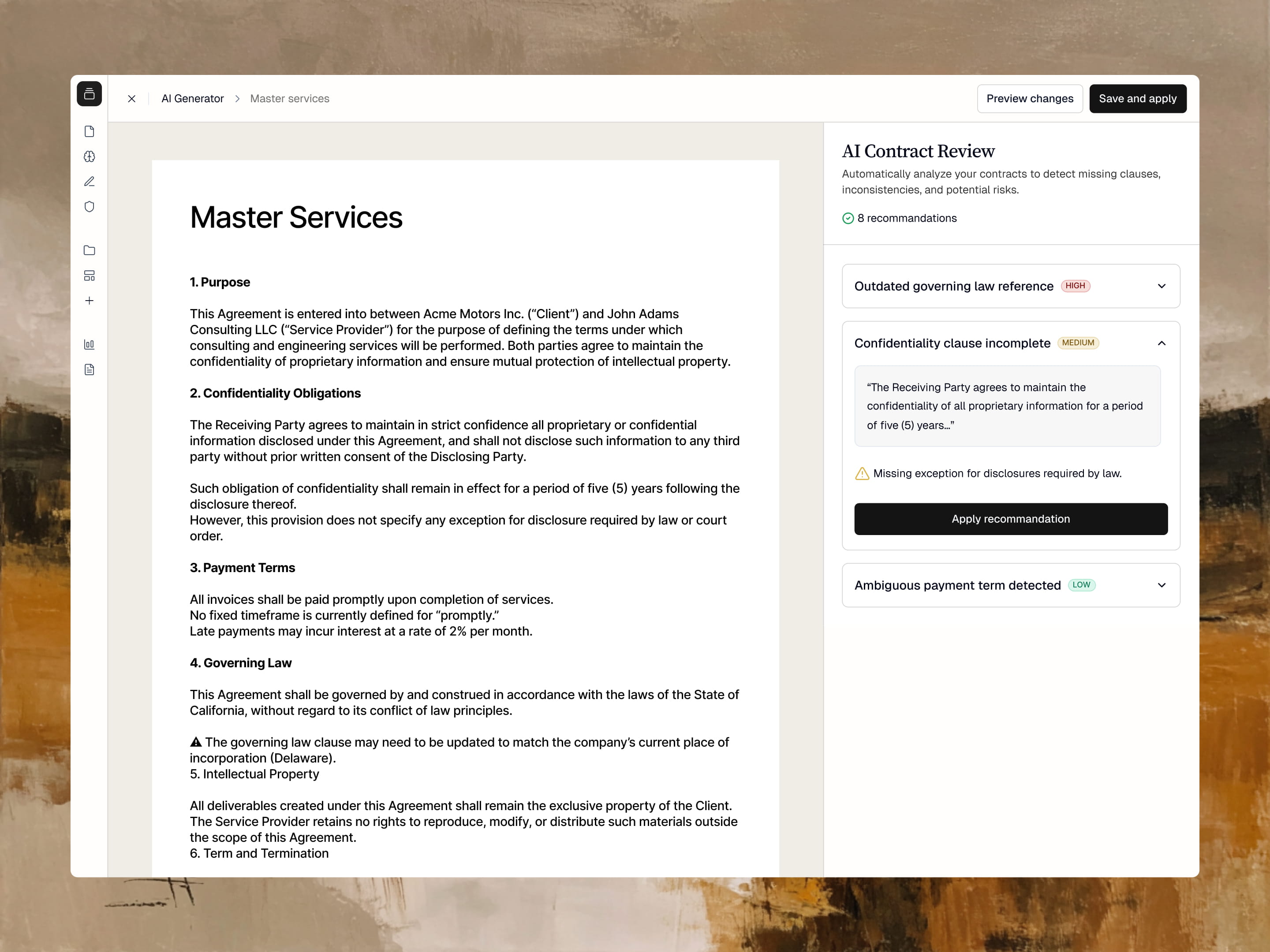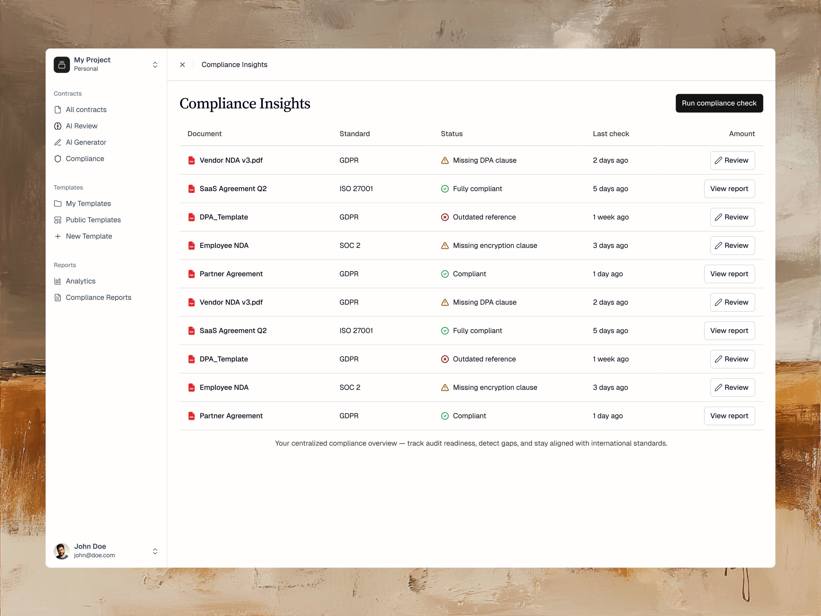 Instantly detect risks, missing clauses, and inconsistencies, powered by legal-grade AI.